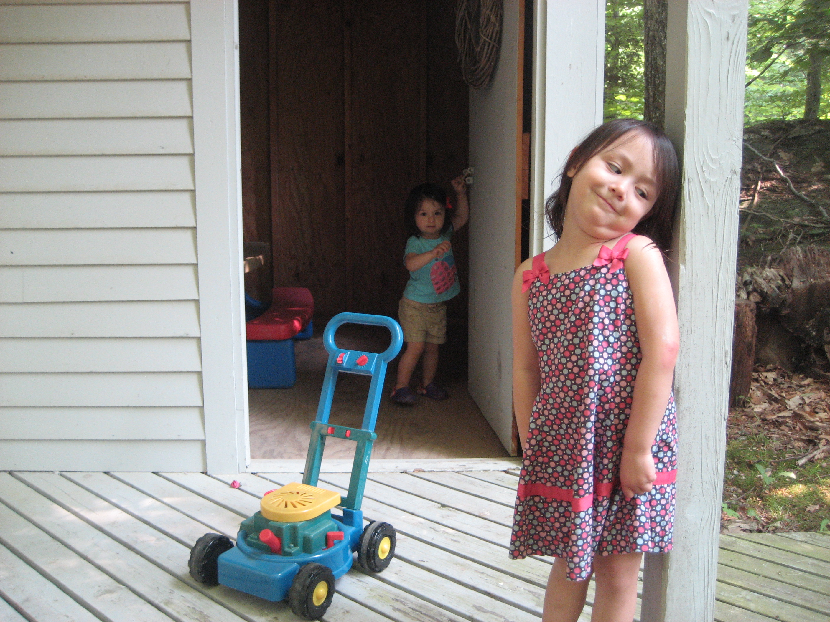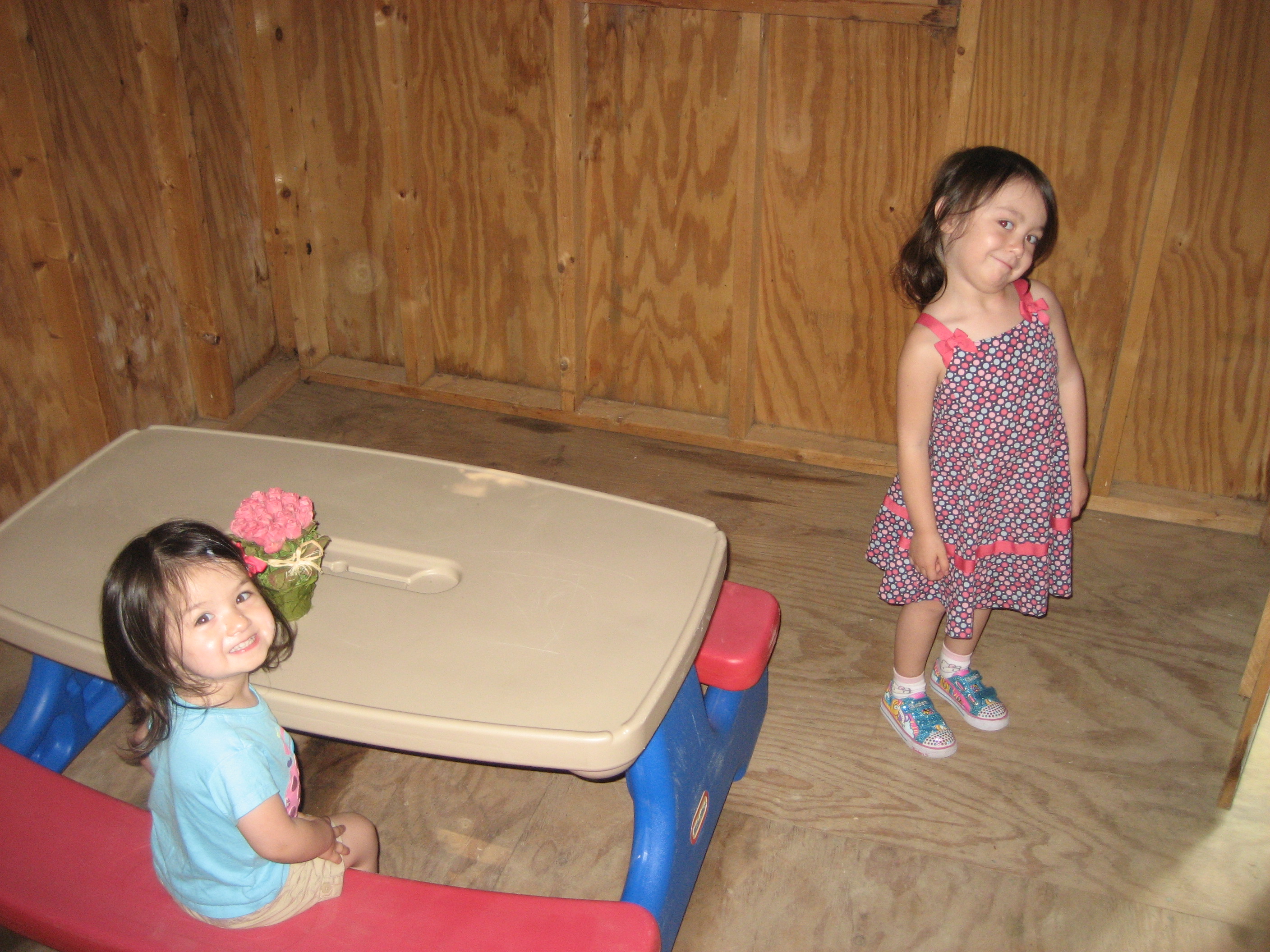 Notice the little shed, which is meant to be used for useful storage but of course has been claimed by the Gong Girls as a play house.