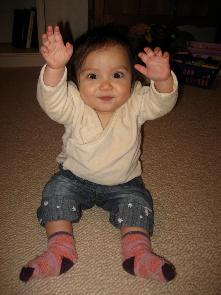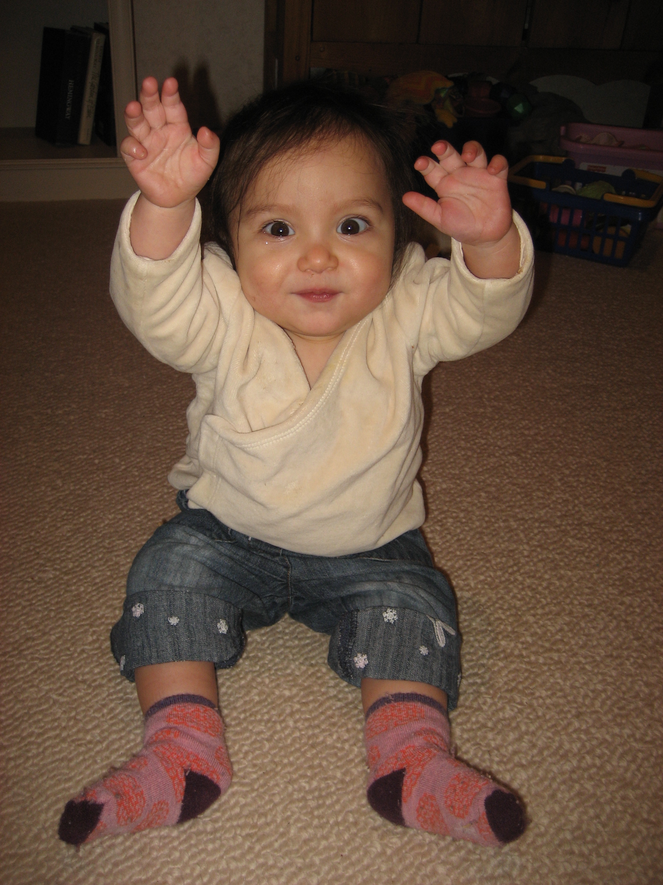 -Also unlike both her sisters, she has four whole teeth at the age of one (they both got teeth much later), comforts herself by sucking on two fingers (neither sister did), and is crawling (neither sister crawled before walking).