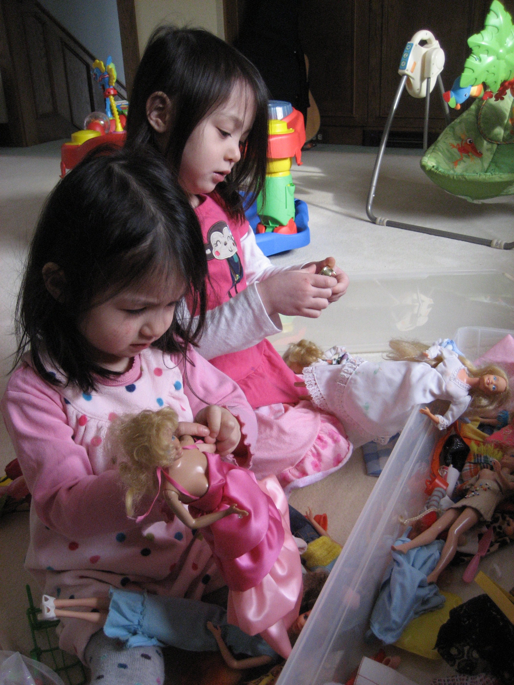 Here’s what I can control: the attitudes I model to my girls about Disney princesses and Barbies. So I don’t go overboard with enthusiasm when it comes to these toys. During Fiona’s Disney princess mania, I quietly steered her towards Pocahontas and Mulan, and she remarked, with admiration, that they were the “strongest” princesses. I have personally bought them almost nothing related to Disney princesses or Barbies; they have one tub of my old Barbies (Doesn’t recycling offset the ethical concerns?), and their grandparents supply the rest (and if parenting’s taught me anything about grace, it’s that you don’t muzzle the grandparents!). Never once have I said, “Hey, let’s play princesses/Barbies!”