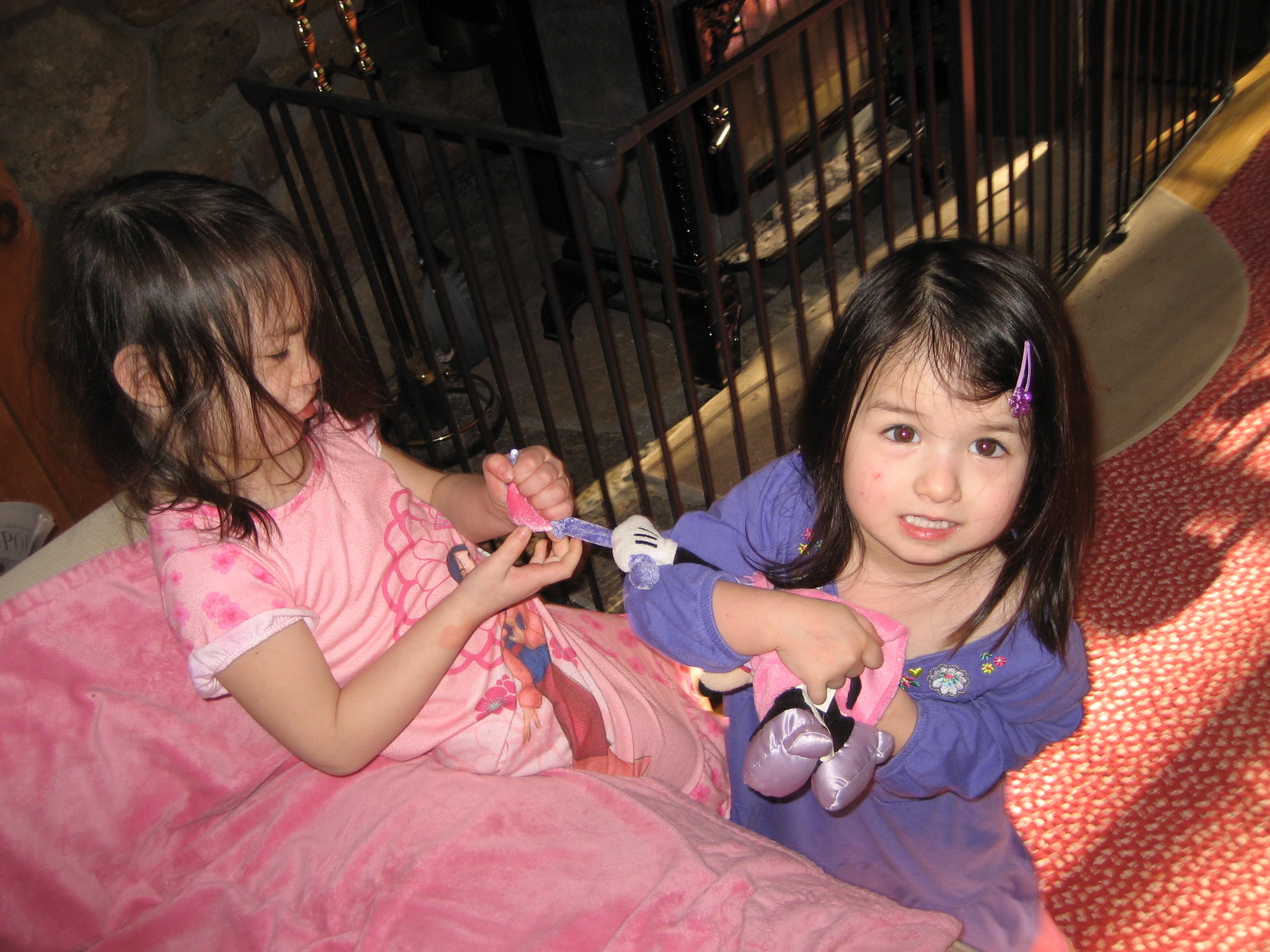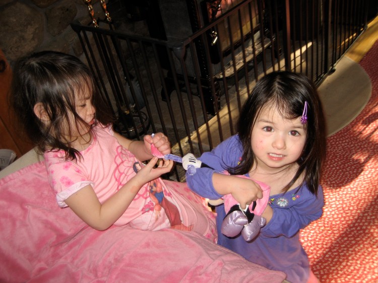 -At least 37 times a day, Campbell comes to me complaining (loudly): “Mommy, Sister won’t give me the doll/toy/marker/book.” I’ve learned that my first question should be, “Well, Campbell, did you ASK her for it?” Because over half the time, the answer is “No.” And once Campbell goes back to Fiona and simply asks for whatever it is she wants, chances are good that she’ll get it. (Or at least, she’ll get it after Fiona’s “done with it,” which often requires persistent requests every few seconds).