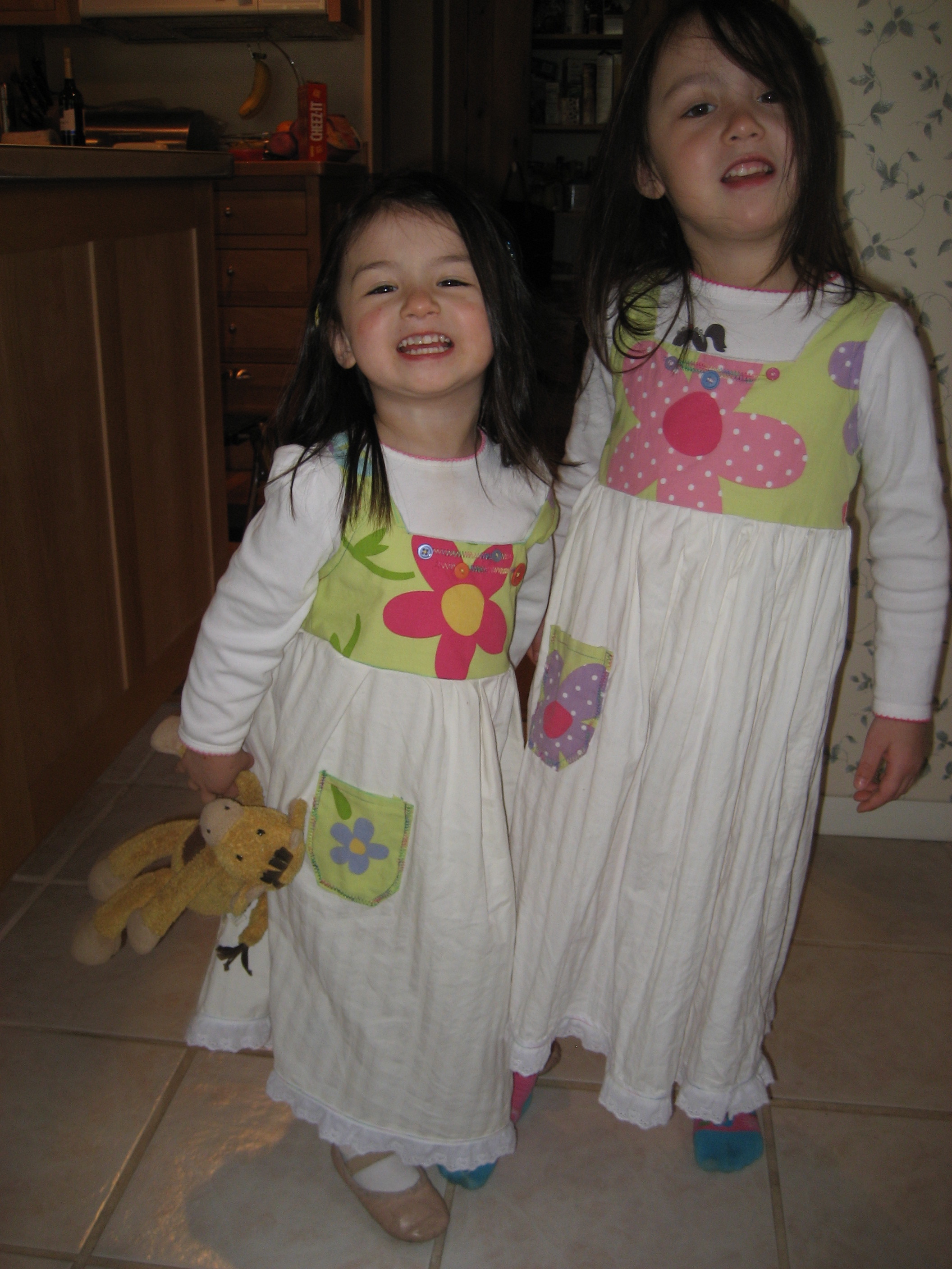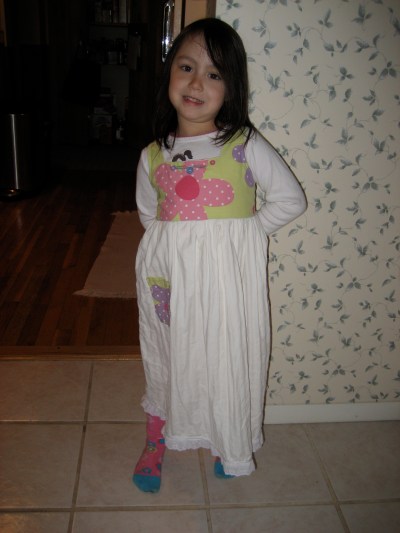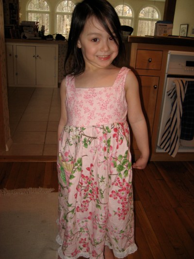 Four-year-old girls and fashion are a funny combination. It amazes me how opinionated and stubborn Fiona is about her wardrobe; what she deigns to wear or rejects as unwearable follows no logic that I can discern. This can be heartbreaking for parents who have bought or made special clothes. Case in point: the mother of one of Fiona’s friends sewed her daughter an absolutely gorgeous dress — this is a dress that I would wear in a heartbeat. Her daughter refuses to wear it.