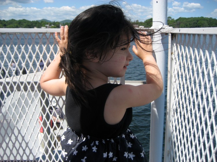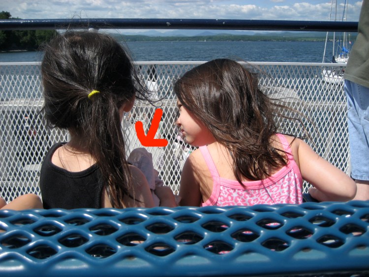 It happened this past Saturday, a hot and humid day, when we decided to take the ferry across Lake Champlain to get ice cream in the quaint town of Essex, New York. The ferry ride was refreshingly breezy. Very, very breezy. Pink Sweetie was along for the ride. And then, right in the middle of Lake Champlain, Campbell held on to Pink Sweetie a little too loosely, and Pink was ripped from her hands and blown overboard.