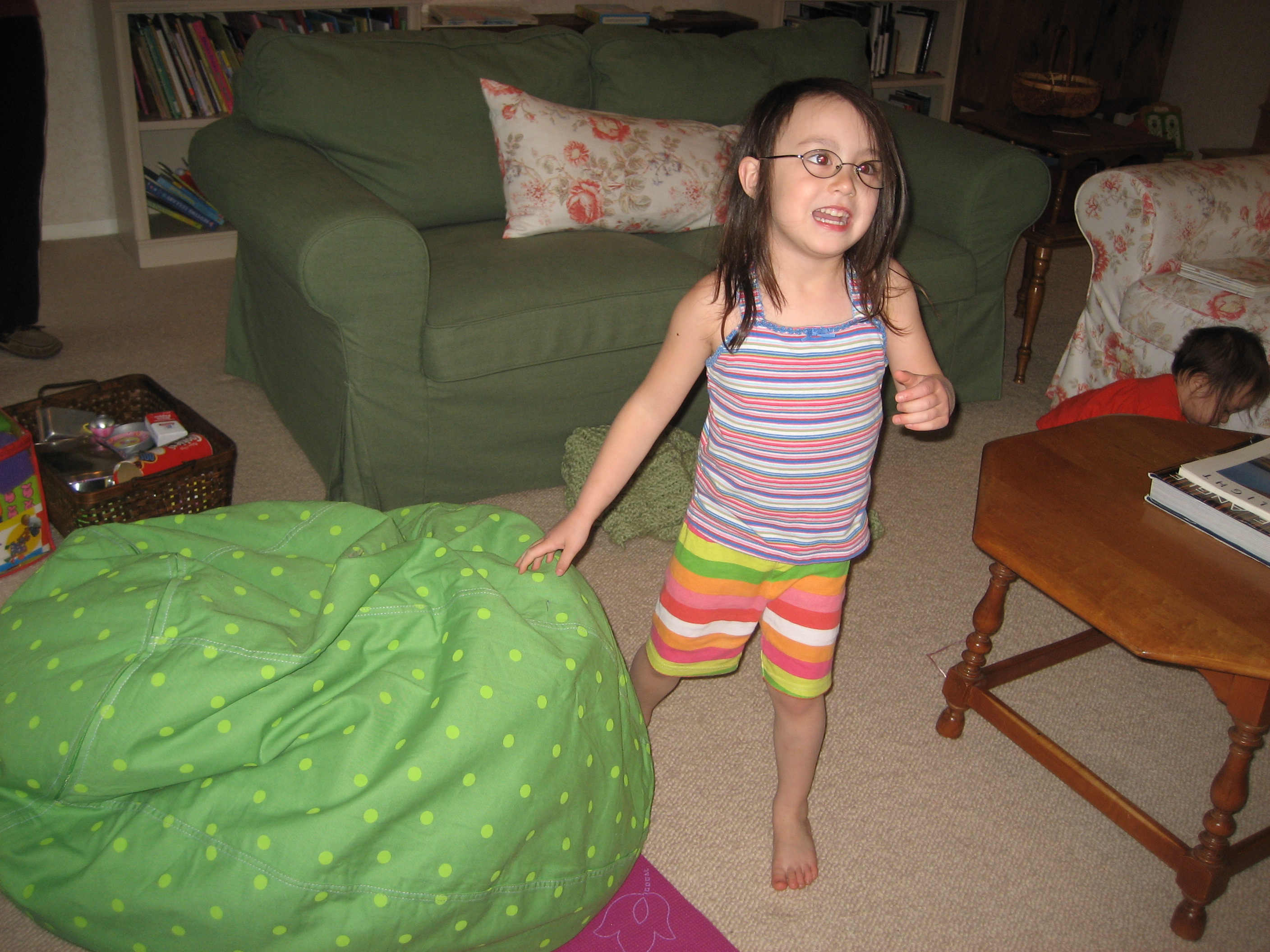 Fiona (wearing my glasses) attempts to lead us in “yoga.” (Yoga, apparently, involves kicking a beanbag chair while yelling “Hi-YA!”)