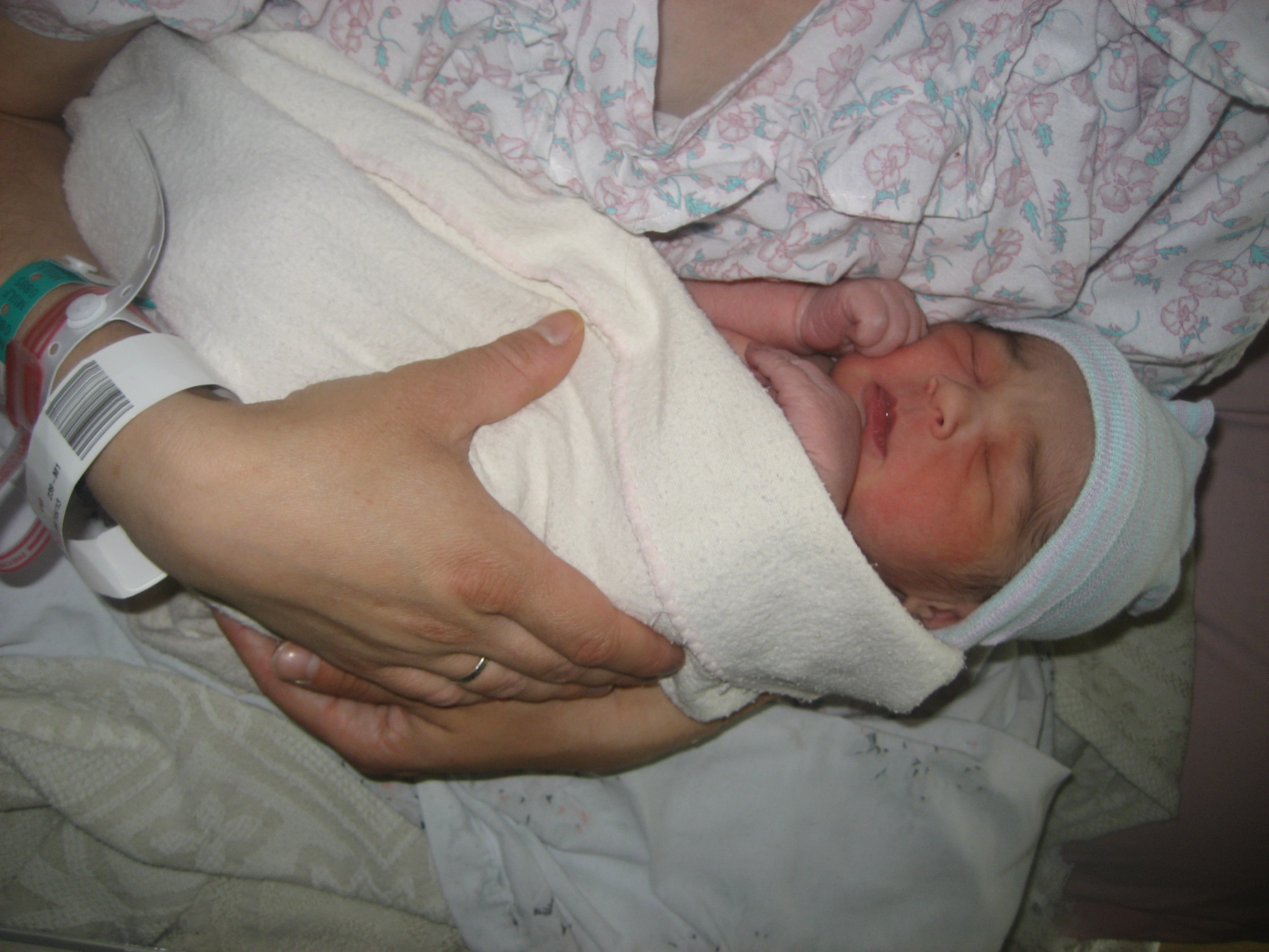 We’re all back at home and doing well. Fiona won’t let anybody else hold Abigail if she’s around. Campbell’s stated goal is “to teach Abigail about horses” (Today’s lesson: “NEVER walk BEHIND a horse, Abigail!”). Georgia is giving Abigail lots of sweet head-kisses, and then trying to poke her eyes out. Gracie went through an initial freak-out because she couldn’t understand why a little person was stuck to me, but she quickly figured out that Abigail was one of her people. Now, whenever Abigail so much as peeps, Gracie runs over and licks her head.