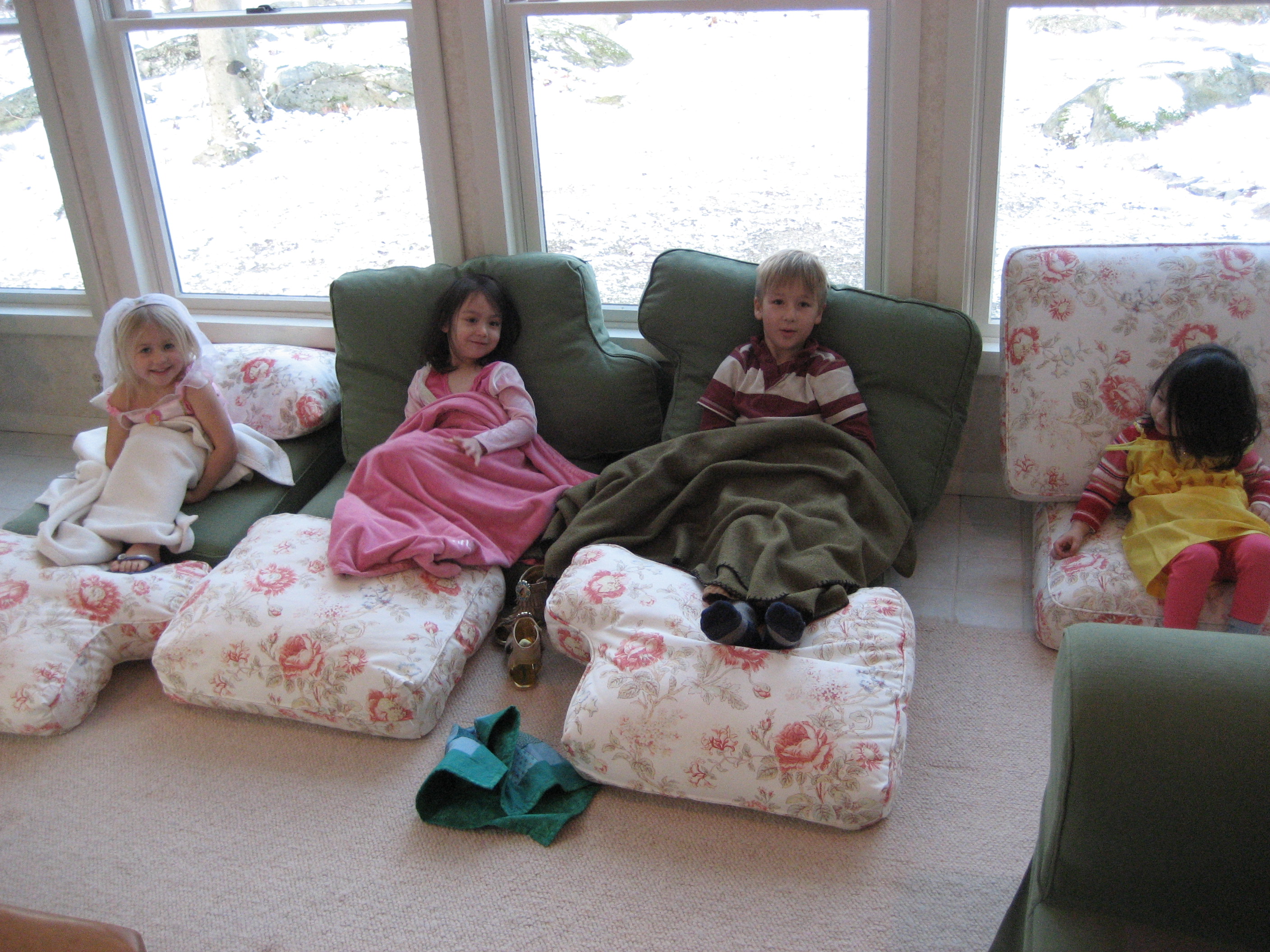 What they’d rather do is pull all the cushions off of the sofa, take off all their clothes, and pretend to be princesses/lions/Barbies. And the oldest two are old enough now that they don’t even need me, except for every 5 minutes when they suddenly demand my COMPLETE FOCUS so that I can be the evil stepmother/witch/fairy in their story. That’s 5 uninterrupted minutes when I can clean something/throw dinner in the crockpot/check email (not necessarily in that order).