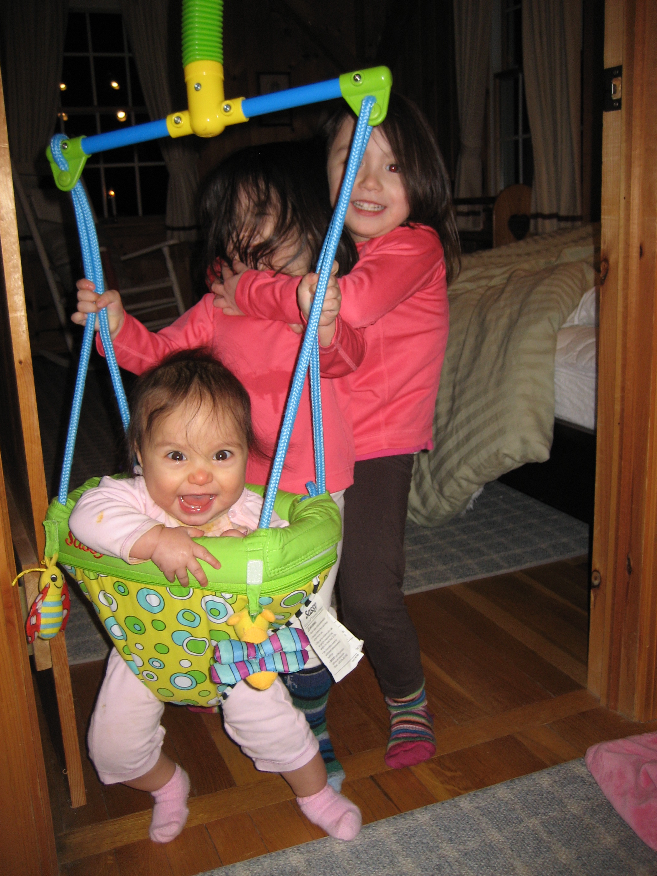 -And finally, the sleeping situation. One of the best parenting decisions we ever made was to have our girls share a room. This was partly necessity: living in the Bay Area on a graduate student’s stipend, we couldn’t afford to rent more than a 2-bedroom house — and partly philosophy: we knew from recent travels in East Africa that our girls were lucky to have beds, let alone a room/we hoped they’d learn the joys of sharing/we hoped they’d become better sleepers as a result.
