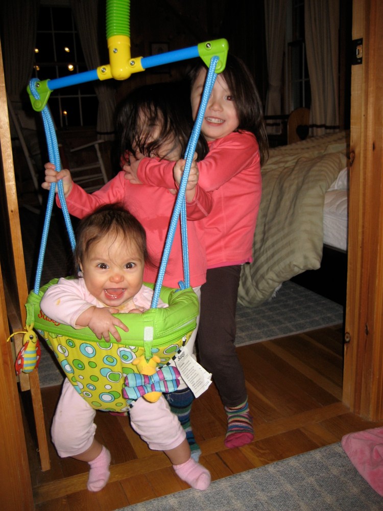 Where Georgia will fit in to all of this, I just don’t know. What I do know is that both of her older sisters adore her, and they want to hug, hold, and carry her until she gets fed up. Georgia adores them back; her huge smile lights up whenever she sees one of her sisters, and she is just chomping at the bit to be able to join in their shenanigans. But the oldest two are so close, it’s almost enough to make us have a fourth child just to give Georgia her own special buddy. Almost.