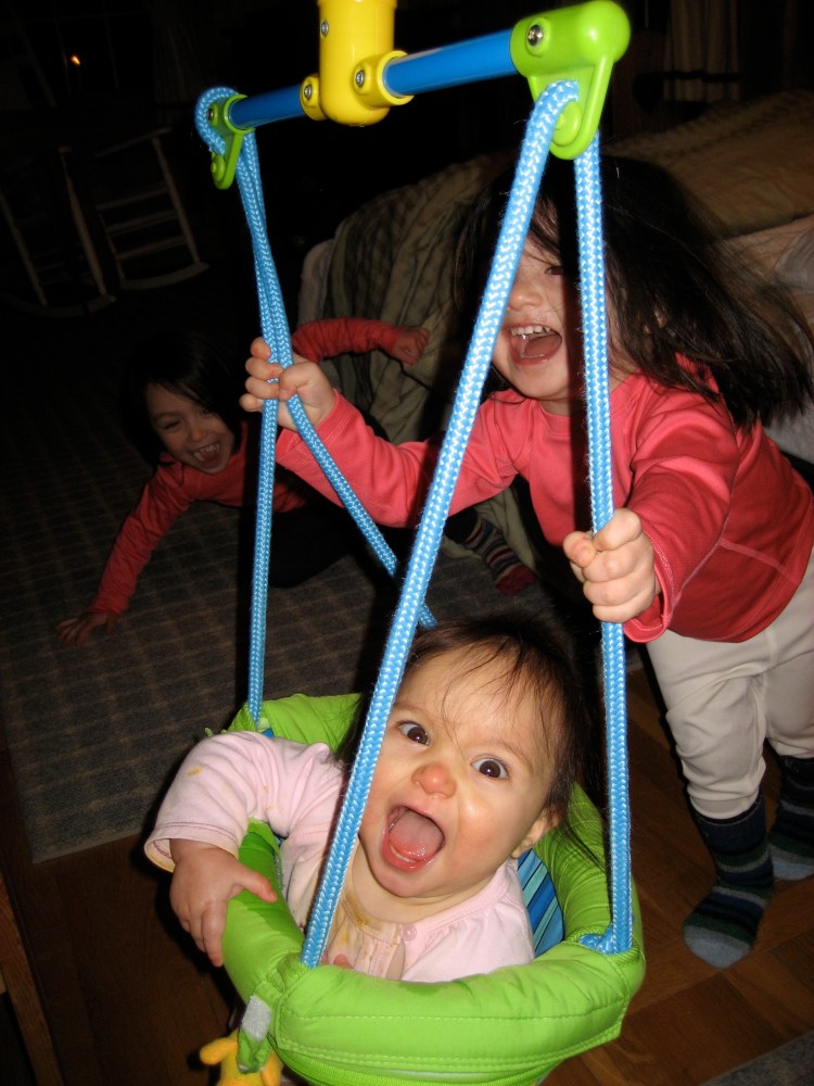 Our three girls are 20 and 19 months apart, respectively. Fiona tells me she has no memory of life without Campbell. (Which really makes me wish we hadn’t crammed so much into those first 20 months of her life. Taking a 4-month-old to the aquarium? Can you say “First-time parents?”). I’m willing to guess that, when Campbell’s old enough to express it, she’ll tell me she has no memory of life without Georgia. And Georgia will never, ever know what it’s like to not share a house with two incredibly loud and overly affectionate big sisters.