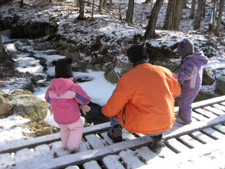 The good news is that it doesn’t take us too long to get to some snow that we can enjoy. As I’m sure you know, the total accumulation and longevity of snow is a function of altitude. For instance, since we live in the woods up on a ridge in the Green Mountain foothills, we get slightly more snow at our house than right in the town of Middlebury. Likewise, if we drive 15 minutes up the mountain, there’s even more snow and it tends to stick around after the snow at our house has melted. So last weekend we took this lovely hike on the Robert Frost Interpretive Trail.