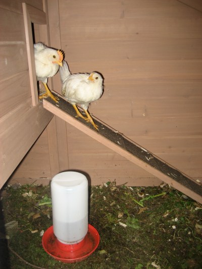 The first day the chickens were out in the coop was pretty harrowing. I was like a new mother, checking her baby obsessively in the bassinet; I kept peeking in the coop, to make sure that they were eating and drinking and alive. Our coop has a fenced-in “grazing” area on the bottom, and a ramp leading “upstairs” to the roost and nesting box. By nightfall, I noticed that our chickens were still hanging out in the downstairs grazing area, which made me a little nervous; safer for them to be up in the roost, protected from predators. Something wasn’t right. By about 10 PM, I couldn’t stand it any longer. I threw boots and a coat on over my pajamas, strapped on a headlamp (since it was pitch dark outside), and tromped out to the coop with Erick wearily following along behind. It was like a scene from every zany “clueless people raising animals” comedy ever made.