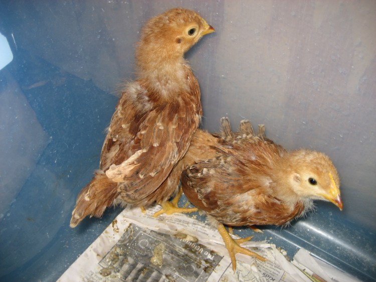 The new chicks are really, really cute, so they’ve been girl-handled quite a bit. I’m hoping that’ll make them a little more cuddly than the Leghorns, who are still pretty flighty.